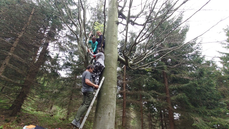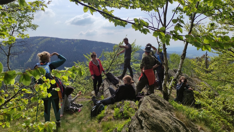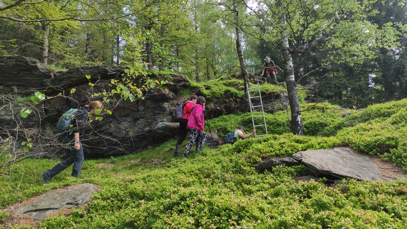 O žebřík jsme se poctivě střídali my tři mužští, když ženské osazenstvo se rozplývalo nad krajinou se svěže zelenými stromy po okolí. O zdejším kopci nám povyprávěla Jiřka pověsti s hady a draky, o nichž se poudalo v Lužici.