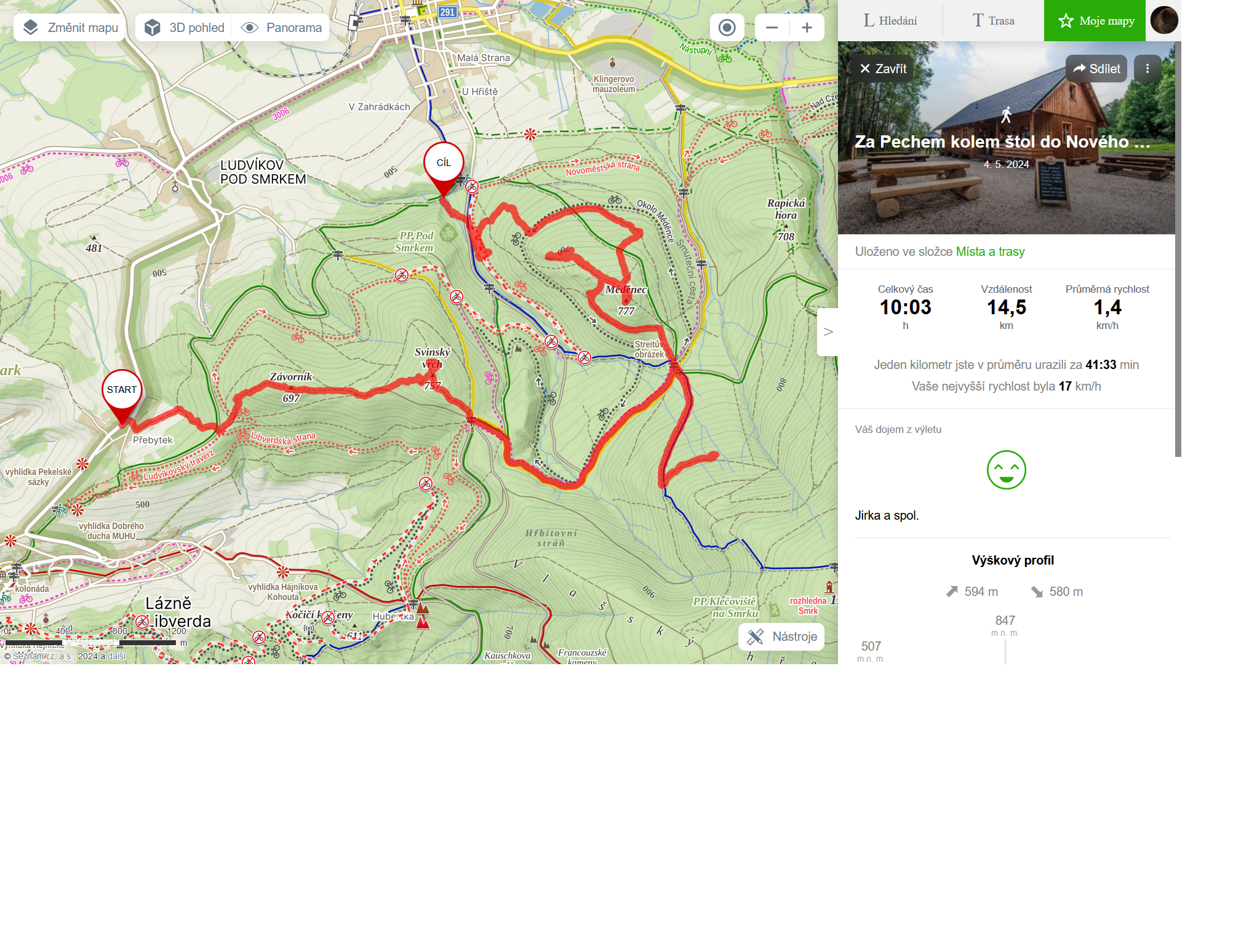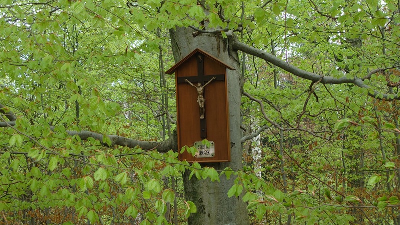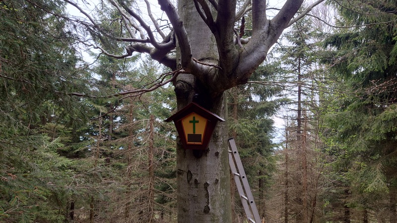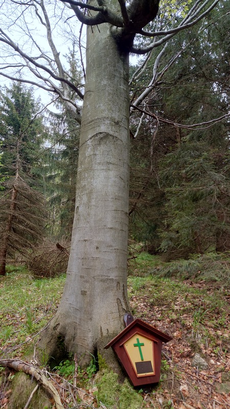Při jídle jsme si díky fotkám zavzpomínali na časy, když byly naše dcerky mladší při pomoci na opravě Streitova obrázku. Po úschově batohů v lesním porostu, se vystoupalo do poloviny kopce Smrk s odbočkou po cestě po vrstevnici. Potkali jsme zde fandu pomníčků Jizerek, který tu marně hledal památku Pecha. Vzali jsme ho tedy s sebou, aby byl přítomen znovupověšení obrázku. Nakonec se mu jako prvnímu podařilo památku objevit. Pechův odkaz ležel opřený o kořeny buku na němž byl původně pověšen.