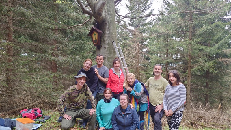 Před několika týdny jsem dostal od Marušky a Rudy upozornění, že památka, kterou jsme věšeli před cca 7 lety spadla a čeká na přidělání u buku. Protože byl potřeba vynést žebřík, dohodli jsme záchrannou akci s Jirkou a spol z Ferdinandova. Krom mě a Šárky, pomoc přislíbili i Pepa, Šárka M., Jiřina s Dinou. Naopak chyběli Ruda s Maruškou, Anežka a jistou chvíli i Jirka M., jenž se však objevil krátce po pověšení. Z telefonního hovoru s Jirkou jsem si pamatoval, že má pro nás po akci překvapení.