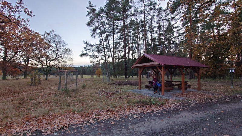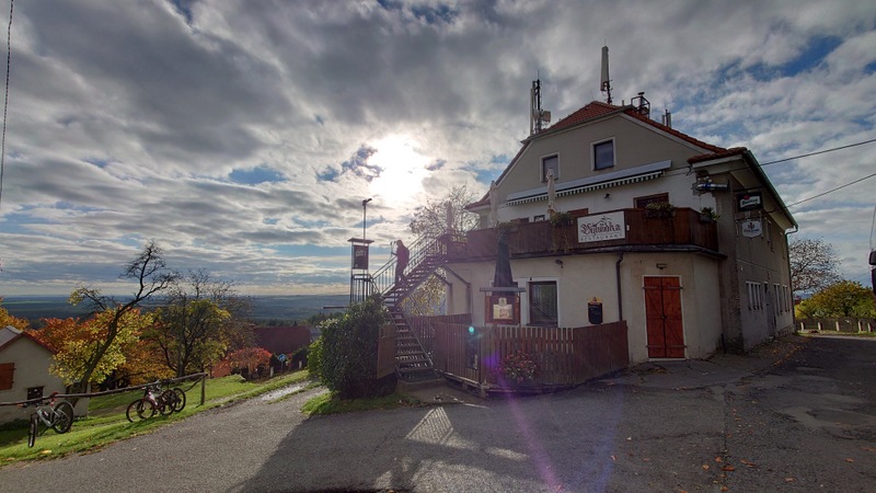Během putování jsem zaznamenával nejbližší vršky do aplikace Horobraní, která mi dávala nový smysl pro návštěvy starých míst. Lenka byla nadšena zdejší barevnou přírodou, ač by raději nechodila po tvrdém asfaltovém terénu, statečně vzdorovala osudu. Závěrečnou trasu do Kuřivod jsem nechal na ní, aby měla možnost zapojit se do společného plánování výletu. Podzimní obloha plná hvězd se pomalu rozjasňovala a naše cílová obec Kuřivody nás vítala za tmy rozsvícenými lampami. Na kryté autobusové zastávce do Mnich. Hradiště jsme si sedli a dojedli zásoby jídla. V Hradišti jela autobus. linka až za hoďku, proto jsme zašli po pečlivém výběru ze dvou restaurací na náměstí, tu s podivným názvem Klášterský hostinec u Karlových Varů. Ceny naštěstí lidové, prostředí bohužel nelázeňské, nabídka strohá. Teplé maliny nevedli, nu což, aspoň jsem si pochutnal na místním ovocném poháru.